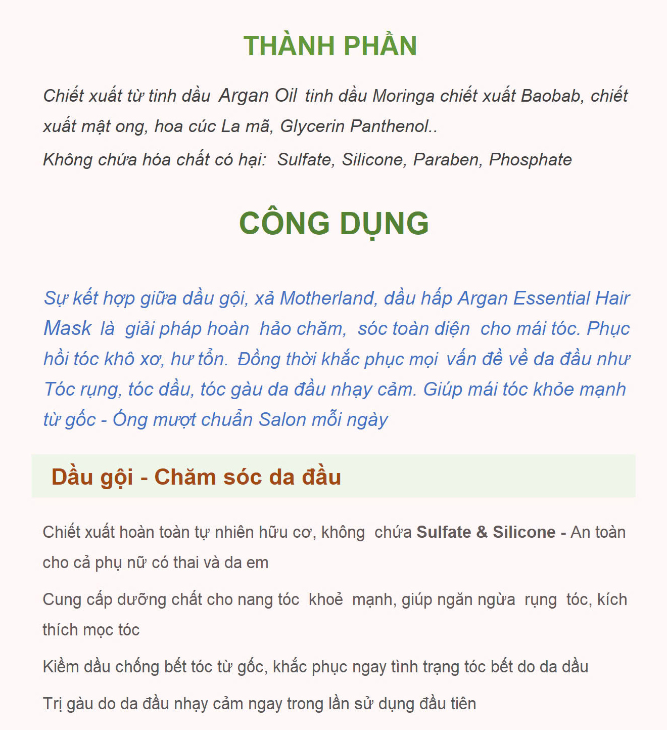Combo dầu gội xả hấp Motherland Argan & Moringa 300ml | Chăm sóc toàn diện cho mái tóc