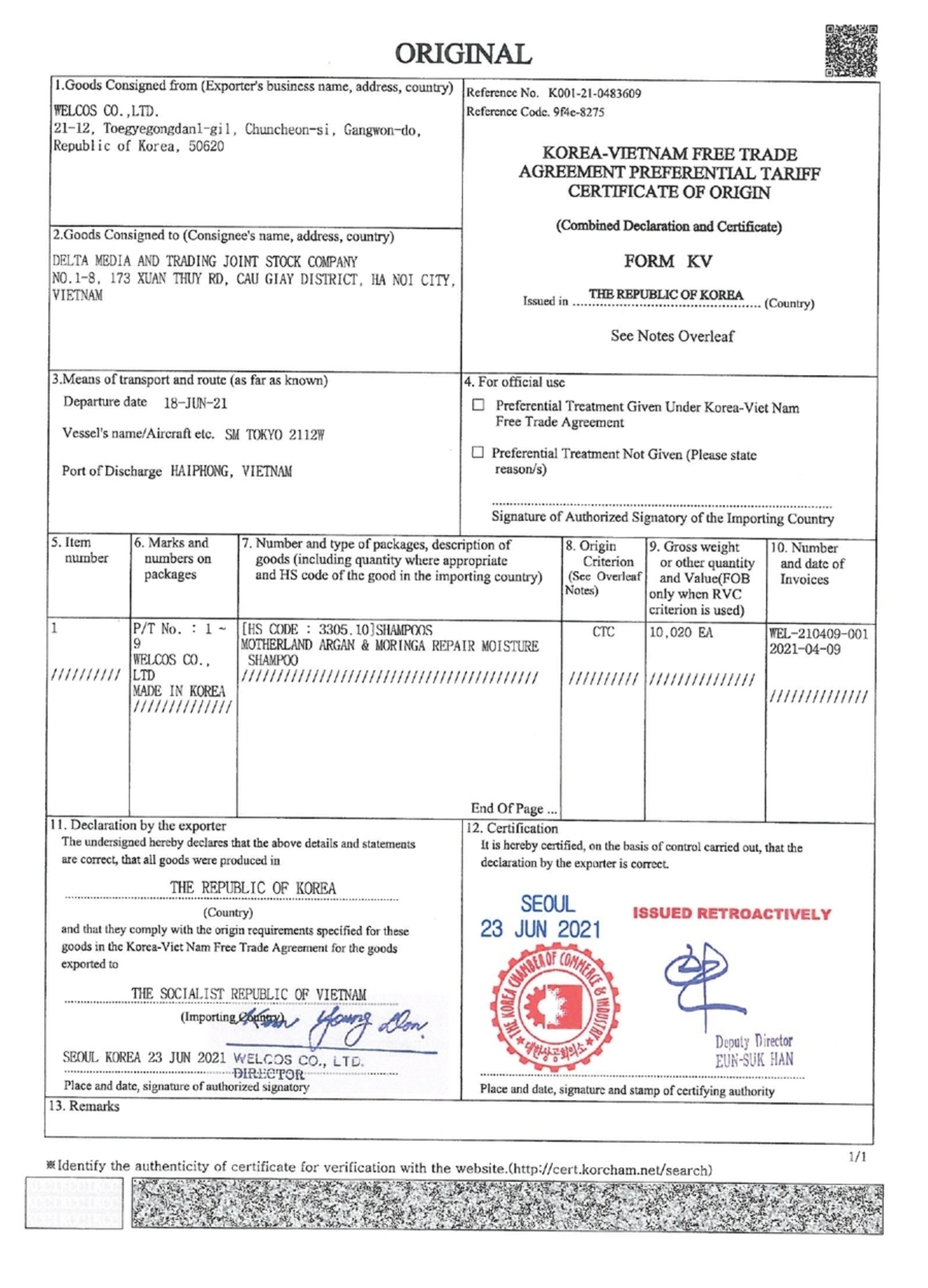 CHỨNG NHẬN XUẤT XỨ CỦA CHÍNH PHỦ HÀN QUÔC